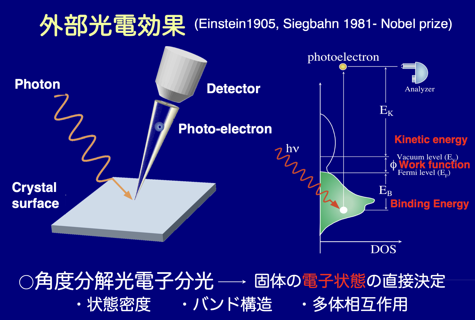 電子を見る方法はたくさんありますが、我々は「光電子分光」という手法を用いています。実はこの光電子分光は、直接的に物質の中の電子状態を見ることの出来る非常に素晴らしい実験手法なのです。
