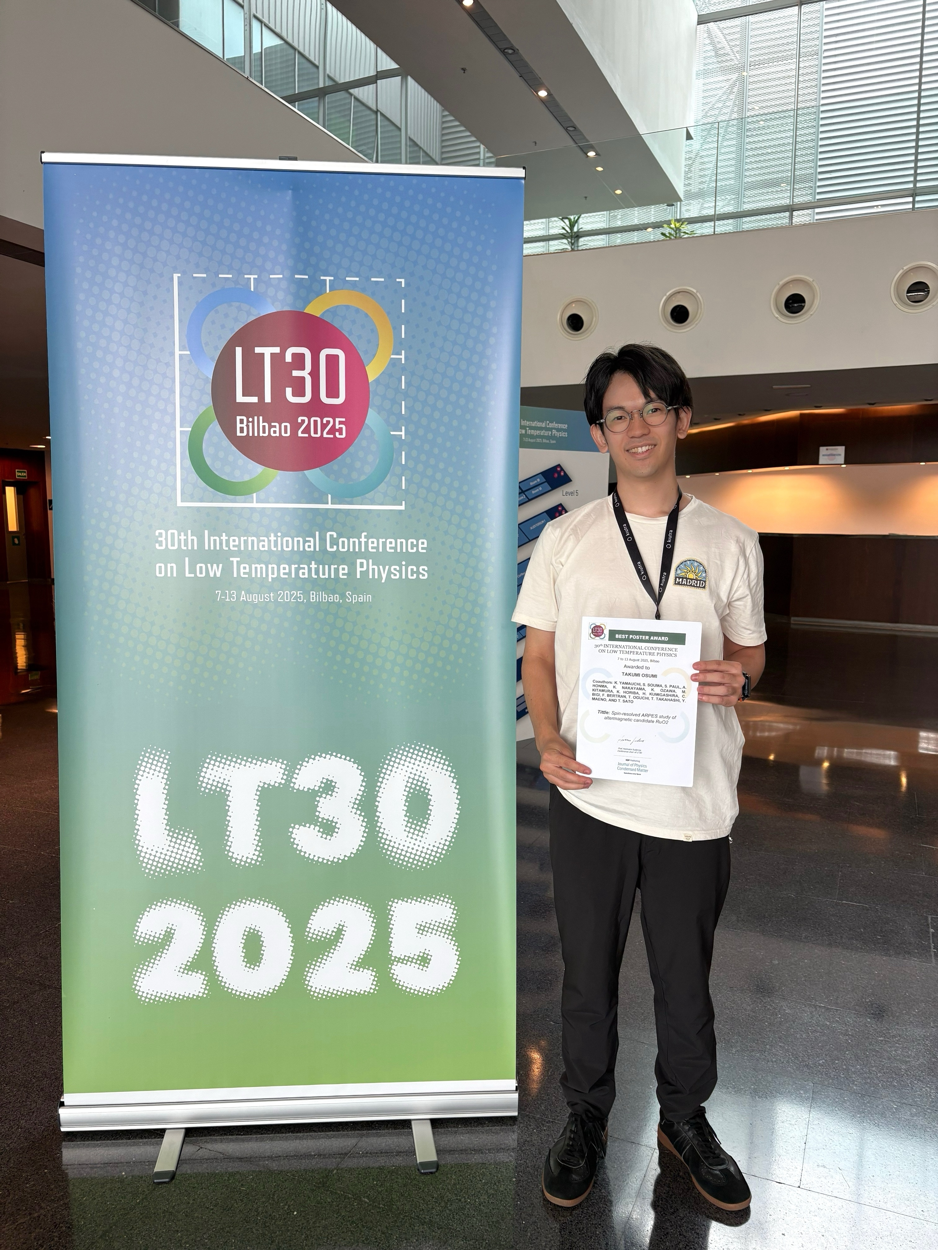 2025年8月10日 D1の大隅拓海君が "The 30th International Conference on Low Temperature Physics (LT30)" でポスター賞(BEST POSTER AWARD) を受賞しました。