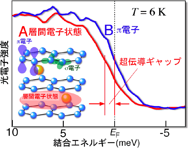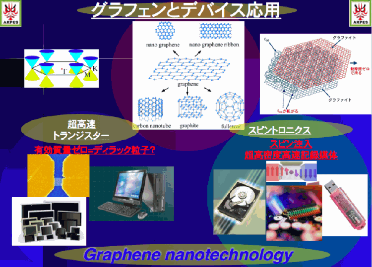 鉛筆の芯にも使われるグラファイトを一層まで薄くした「グラフェン」は、次世代の高機能デバイスとしての応用の観点から大きな注目を集めています(図1)。また、グラフェン上の電子は、質量ゼロの「ディラック粒子」として振る舞う事が予言されています。私たちの研究グループでは、高品質のグラフェンを自ら作成して、そのエネルギーバンドを精密決定する研究を行っています。また、グラファイトにCaを挿入した新超伝導体C6Caにおいて、層間電子が超伝導に関与する事を突き止めました(図2) (新聞発表:黒鉛超伝導体)。